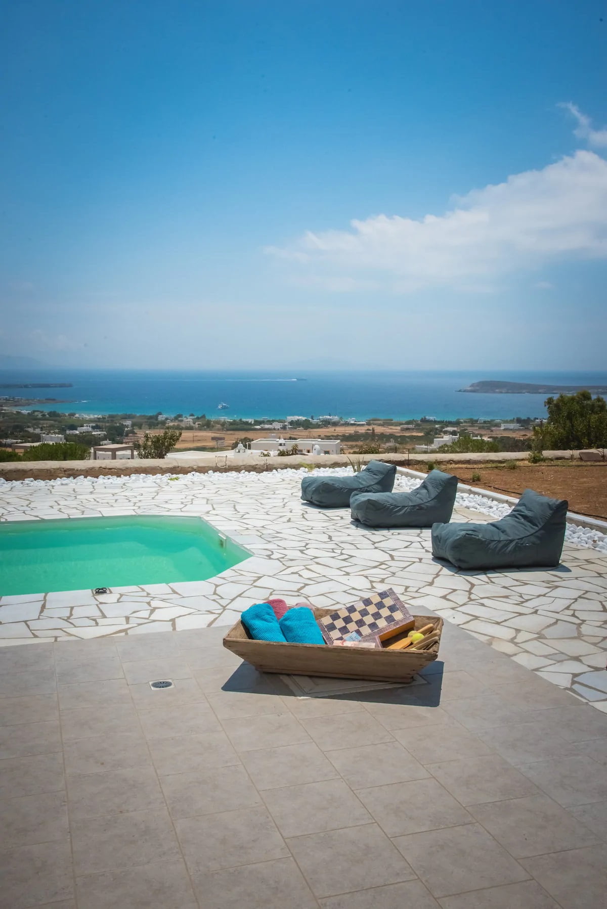 The villa is on a hill, about 2 km above the famous ‘Golden Coast’ (Chrissi Akti) beach of Paros. There may be a bus service running from the main road to other parts of the island and the port of Parikia, however getting to the main road can be a hassle, the itinerary can often be infrequent and untimely.