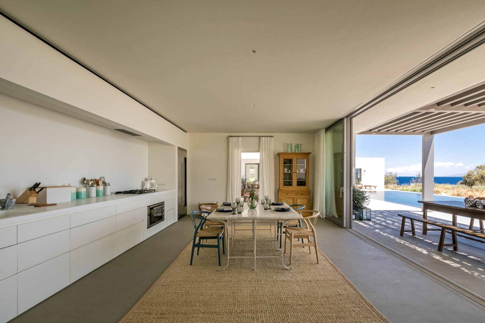The elegantly designed and newly-built exclusive luxury holiday villa Olivia is located on the island of Paros, in the heart of the Cyclades islands complex, and has been designed by the renowned architect John Pawson. It boasts 4 cleverly designed, independent bedrooms. It sits on a 4,600 sqm, fully landscaped plot, and boasts direct access to the seafront, as well as spectacular views across the Aegean Sea and the island of Antiparos from most of its interior and exterior areas, including the pool and outdoor lounge areas, three of its bedrooms, as well as the living room.