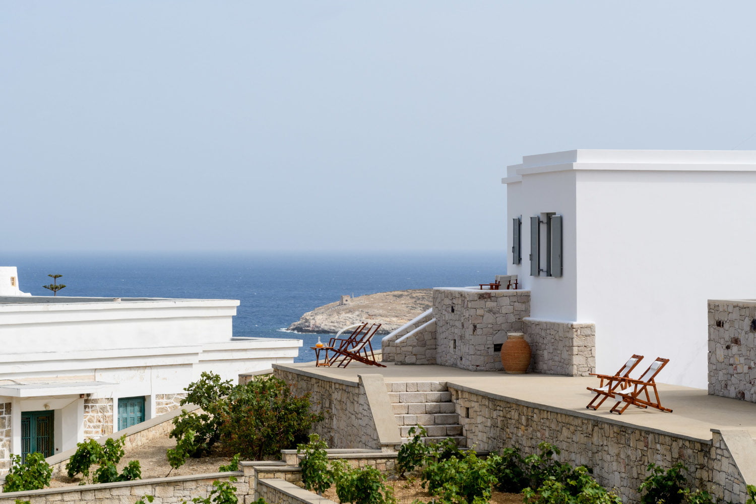 It is positioned at the entrance of the picturesque main village of Kimolos, offering excellent panoramic views of the Aegean Sea. Located in an authentic traditional island estate, complete with vineyards, figs and lemon trees, Villa Leta can comfortably accommodate up to 8 guests in its four bedrooms, and 2 children at sofa beds in the two living rooms.