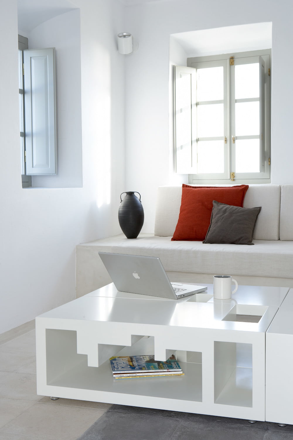 As most villas on this island, the dominant colour is white in villa Vinios. Wooden objects and earthly beige colours emit a more personal touch and complement the otherwise charmingly industrial authentic look that is found throughout the complex.